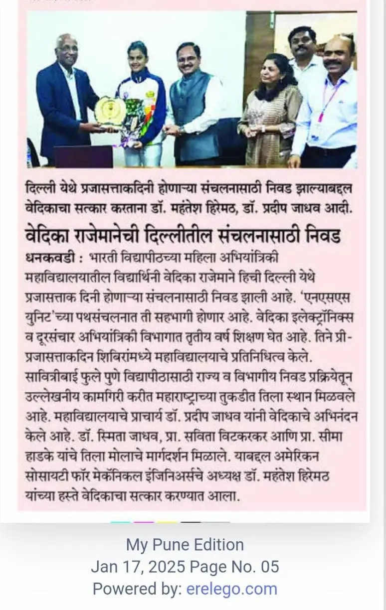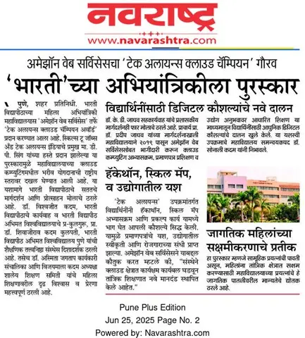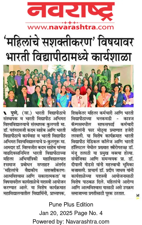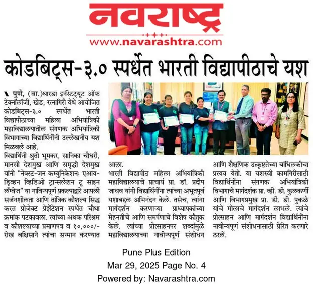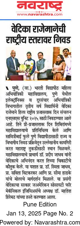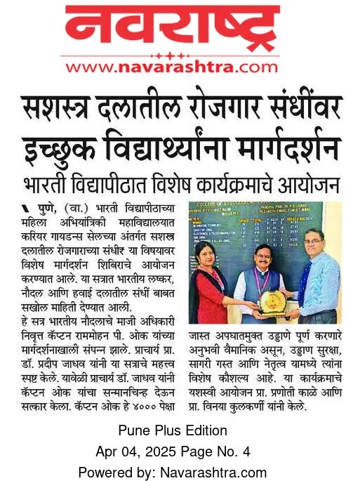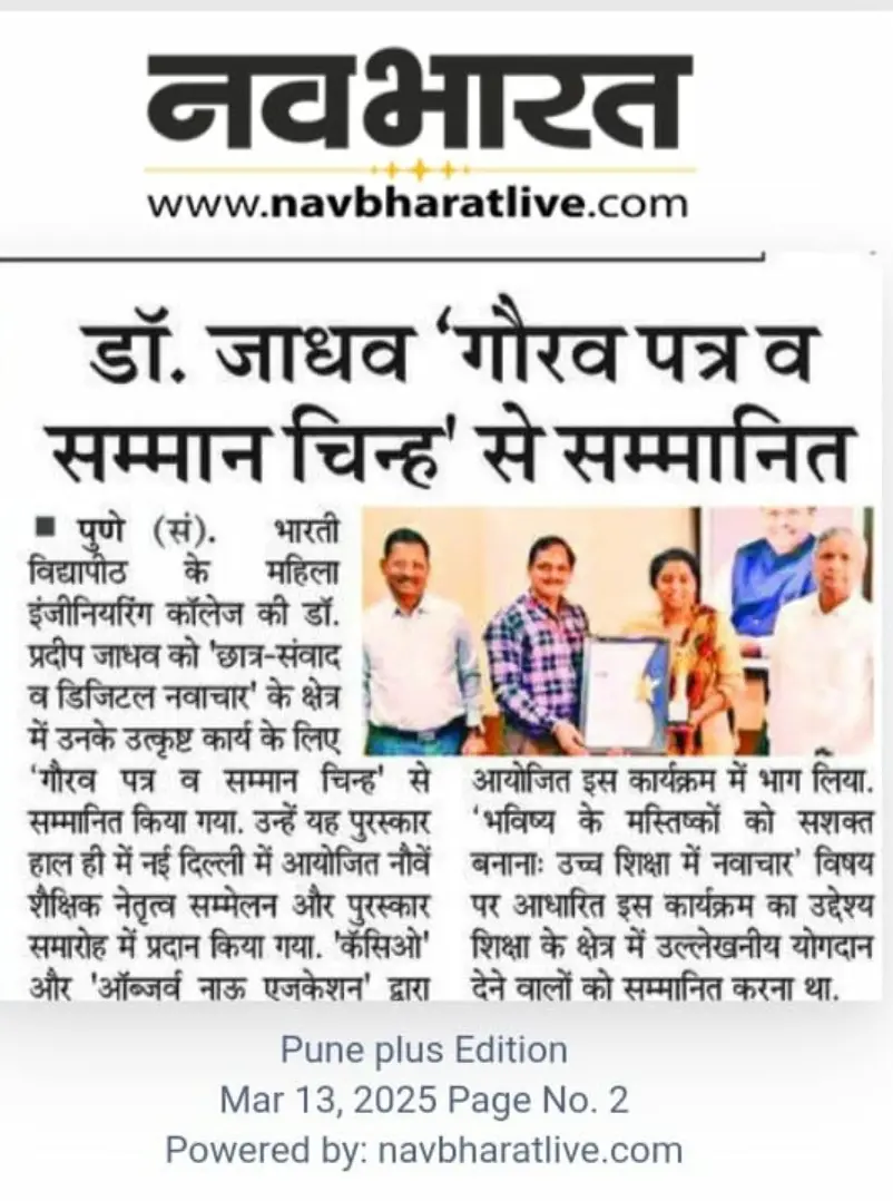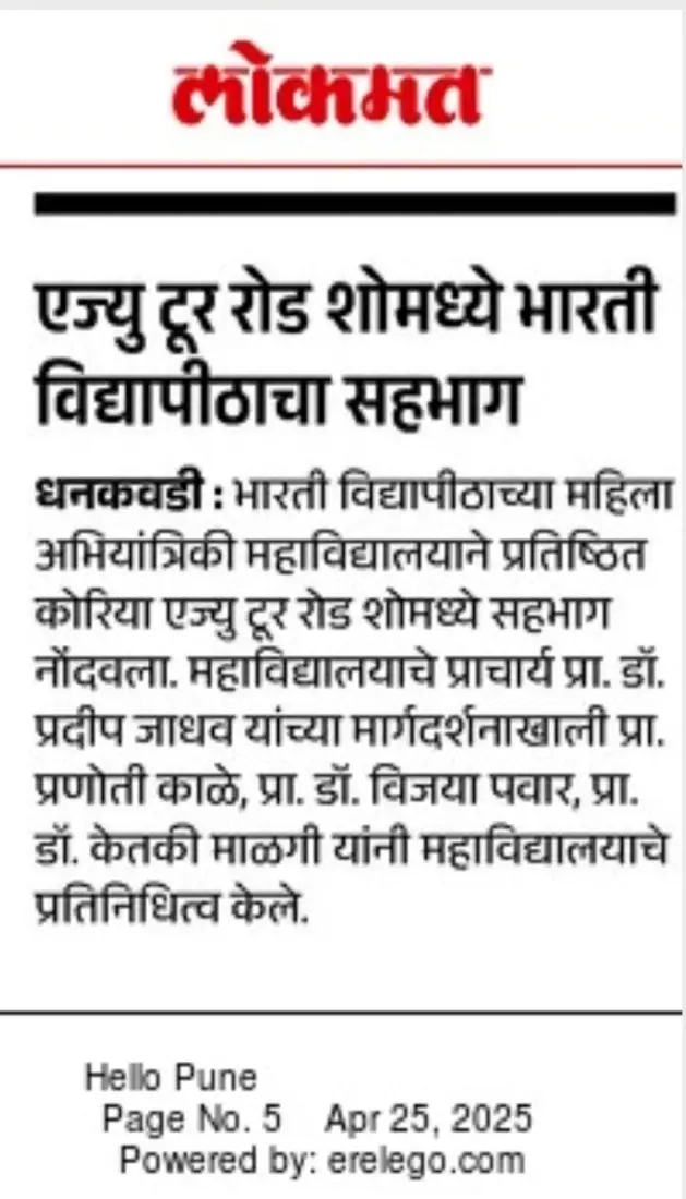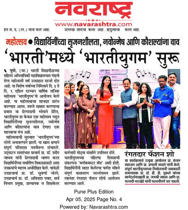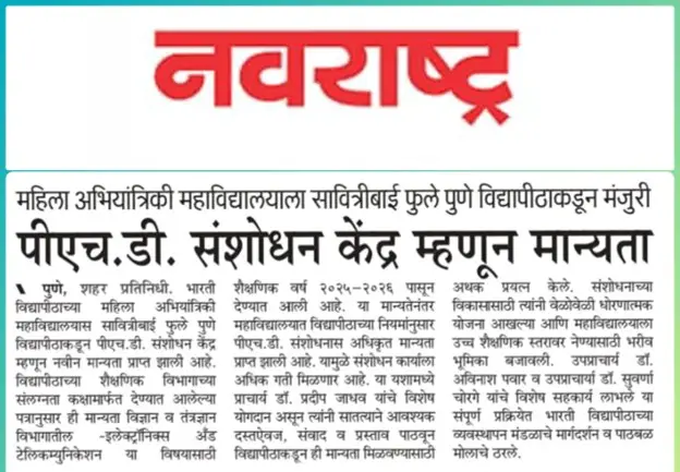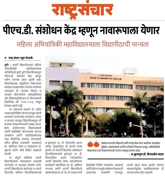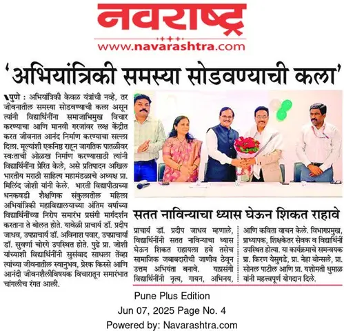 Bharati Vidyapeeth’s College of Engineering for Women was established in June 2000, with the collective efforts of experts having long and outstanding academic experience in the field of professional education with the mission 'Social transformation through dynamic education.